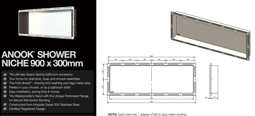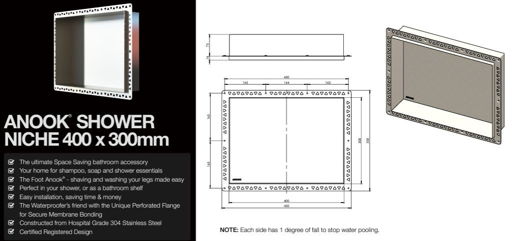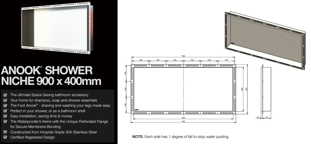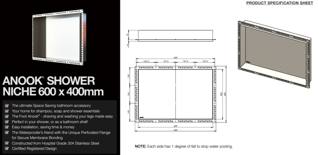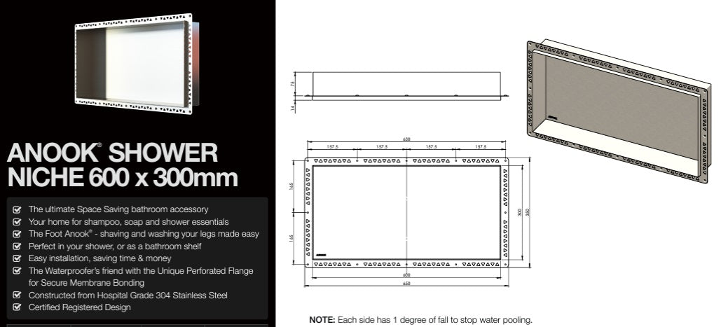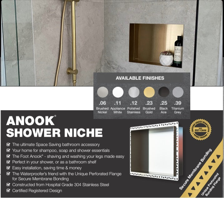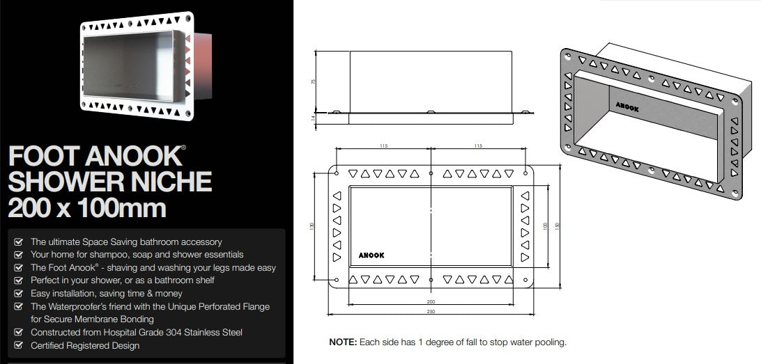 The ultimate Space Saving bathroom accessory Your home for shampoo, soap and shower essentials The Foot Anook® - shaving and washing your legs made easy Perfect in your shower, or as a bathroom shelf Easy installation, saving time & money The Waterproofer’s friend with the Unique Perforated Flange for Secure Membrane Bonding Constructed from Hospital Grade 304 Stainless Steel Certified Registered Design